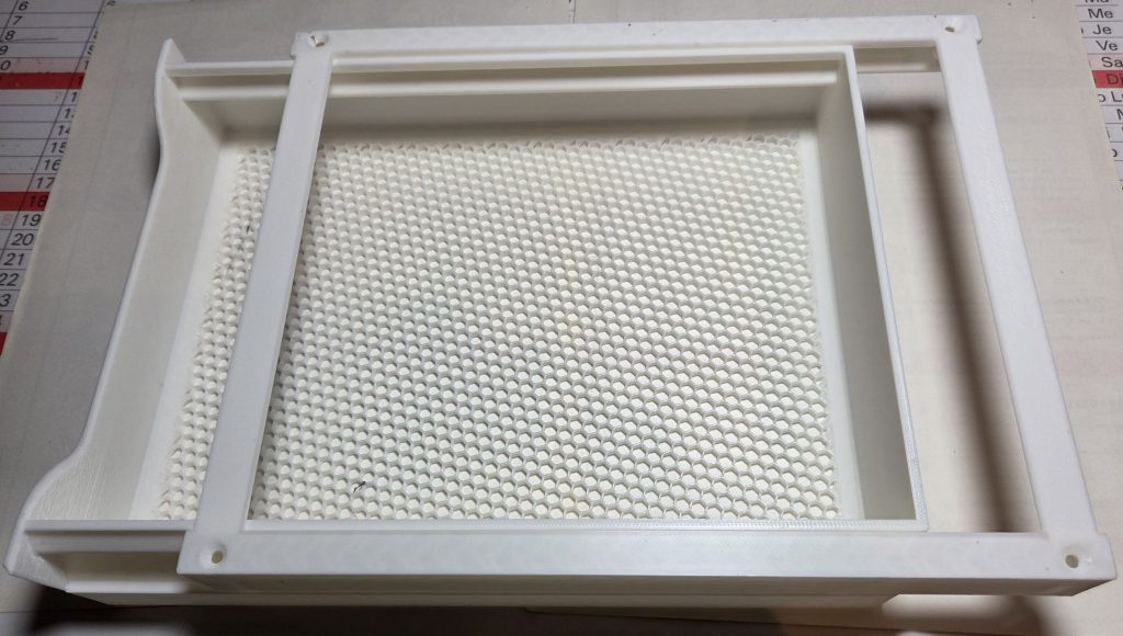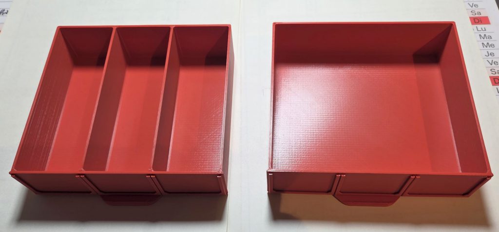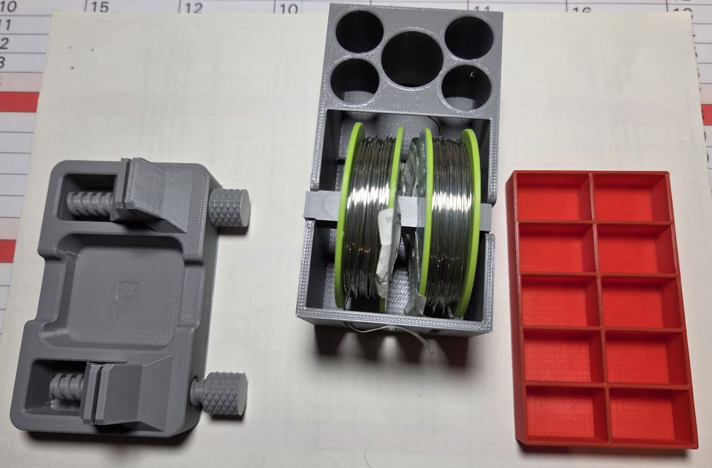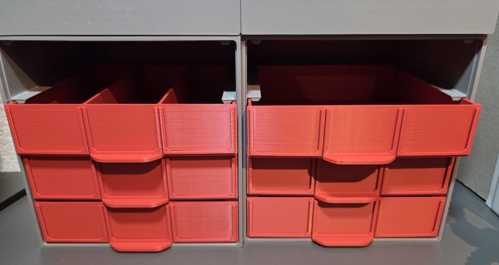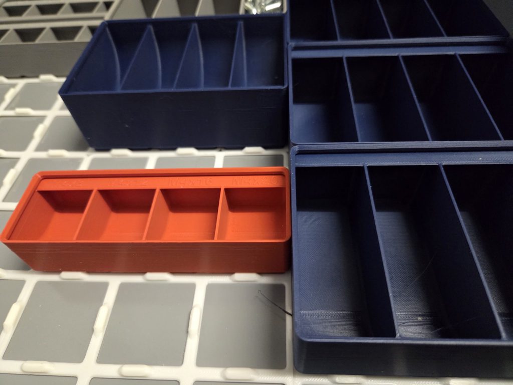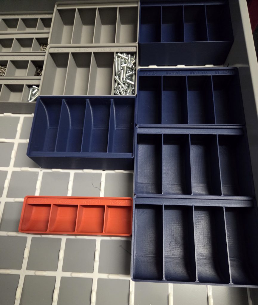 Schraubenbehälter: die Behälter gehören zum Gridfinity-System. Das ist ein Lagersystem basierend auf einem 40x40mm grossen Grundraster (weiss im Bild), auf das die Behälter gesetzt werden. Hier sind Behälter in 3 Farben für 3 verschiedene Schraubentypen zu sehen. Es gibt sie in verschiedenen Breiten/Längen/Höhen; mit Beschriftung oder blank. Es gibt noch ganz viele andere Gridfinity-Behälter.