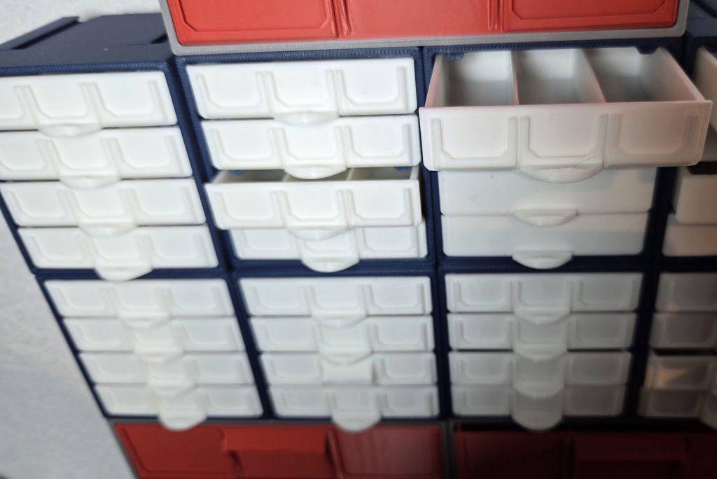 Aufbewahrungssystem mit Schubladen: ein grösseres System mit Schubladen und Rahmen, die mit Steckverbindern zu einem beliebigen grossen Schubladenstock kombiniert werden können. Schubladen gibt es in diversen Ausführungen mit oder ohne Unterteilungen und Beschriftungsfeldern. Die kleinen blau/weissen sind ideal für Widerstände.