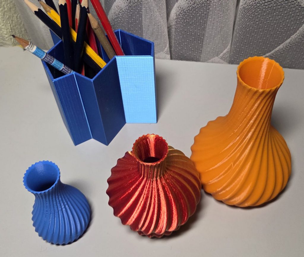 Der Büro- Organizer kann seitlich beliebig aneinandergereiht werden. Die Vasen sind Dekoration – der verwendete PLA-Kunststoff ist nicht wasserfest.